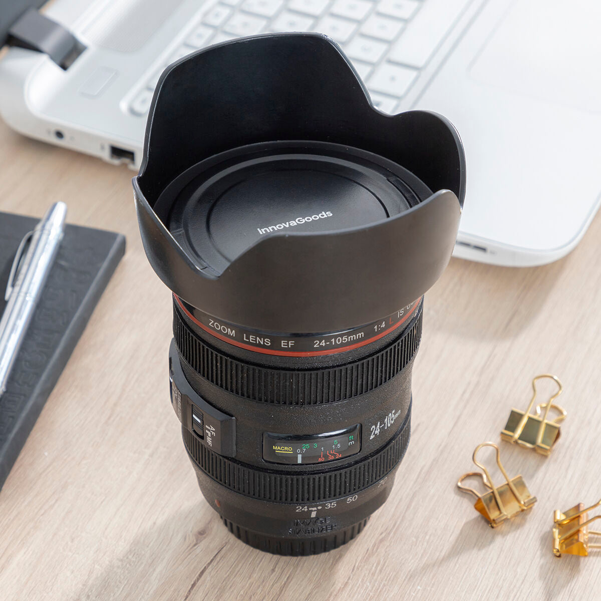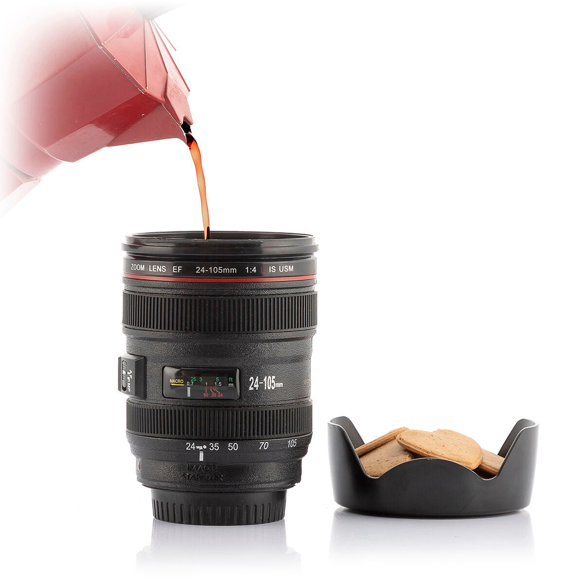 Multifunktionsbecher mit Deckel in Form eines Kameraobjektivs